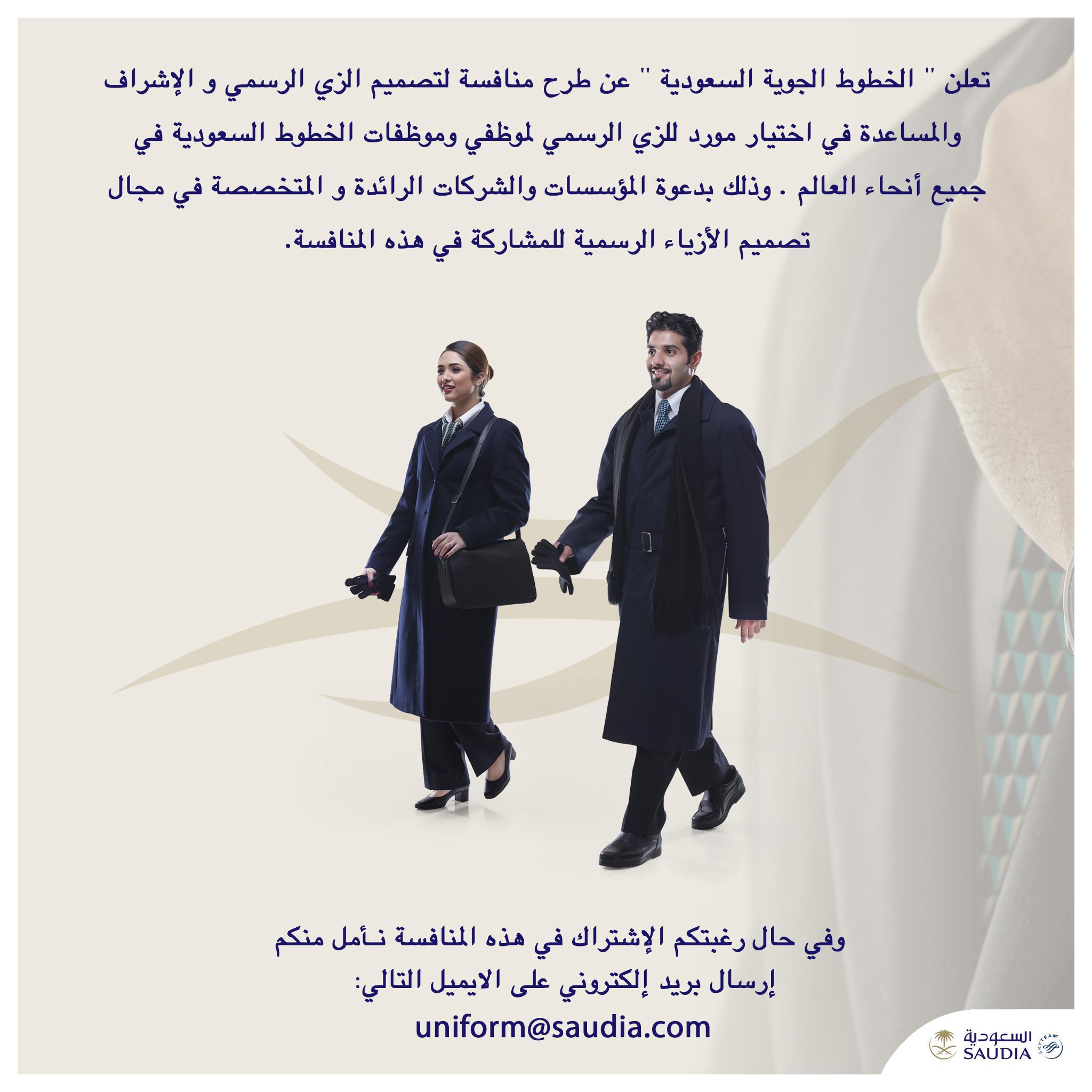 السعودية saudia sur twitter تعلن السعودية عن طرح منافسة لتصميم الزي الرسمي والإشراف والمساعدة في اختيار مورد للزي الرسمي لموظفي وموظفات الخطوط السعودية في جميع أنحاء العالم لمزيد من التفاصيل https t co ihyh3hijvz