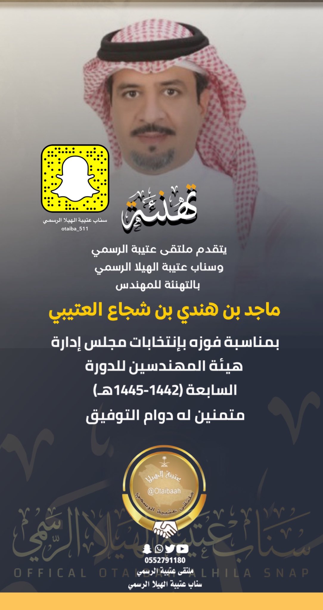 ملتقى عتيبة الرسمي on twitter تهنئة نبارك للمهندس ماجد بن هندي بن شجاع العتيبي mho20211 بمناسبة فوزه بـ انتخابات مجلس إدارة هيئة المهندسين للدورة السابعة 1442 1445هـ متمنين له دوام التوفيق والنجاح