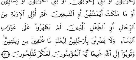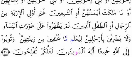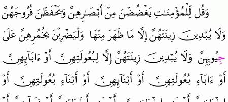 وقل للمؤمنات يغضضن من أبصارهن ويحفظن فروجهن ولا يبدين زينتهن إلا ما النور 31